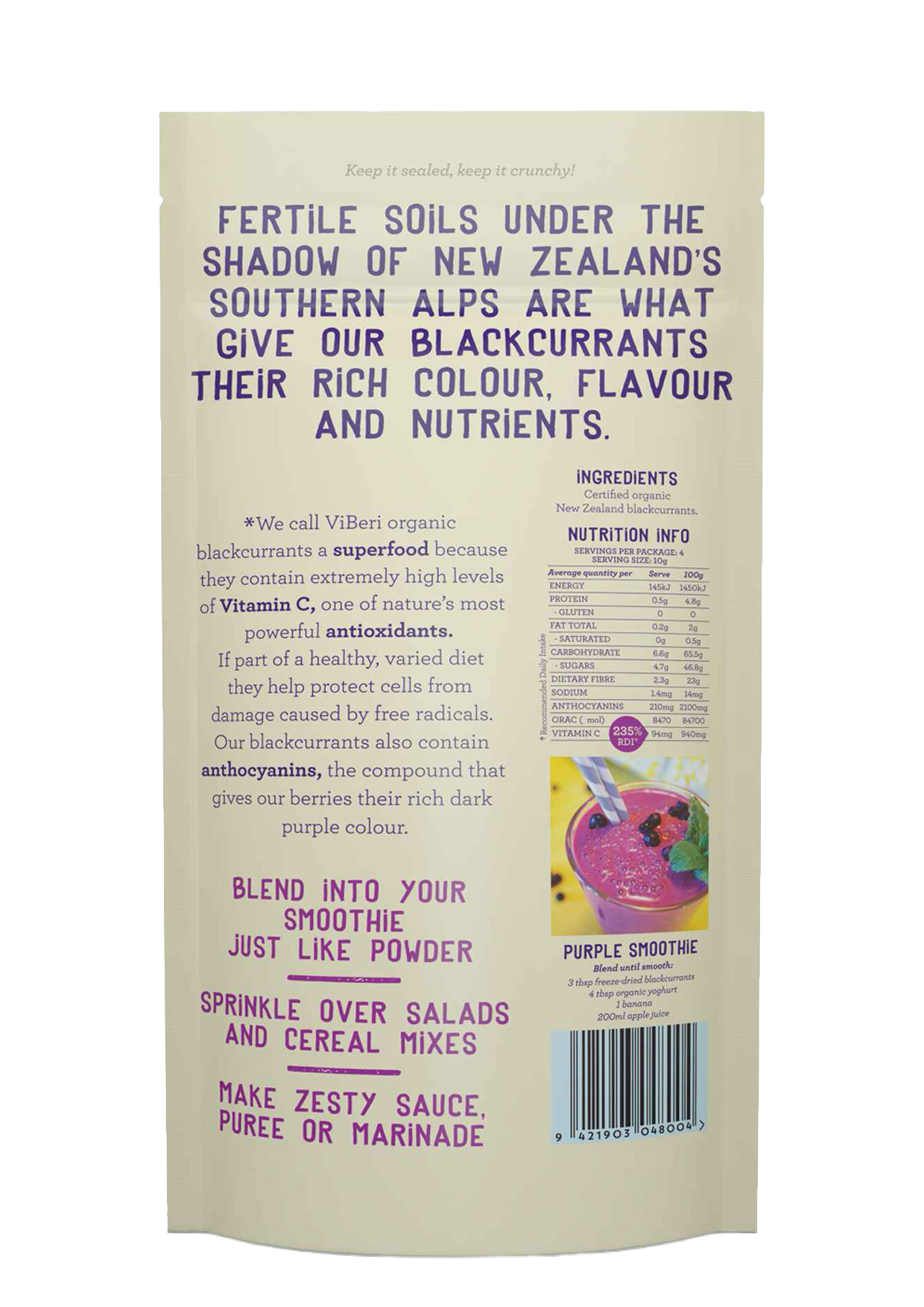 Our ViBERi Freeze Dried Organic Blackcurrants are true to nature: bursting with goodness and a natural source of exceptionally high levels of Vitamin C and anthocyanins which can offer so many amazing health benefits (learn more here).