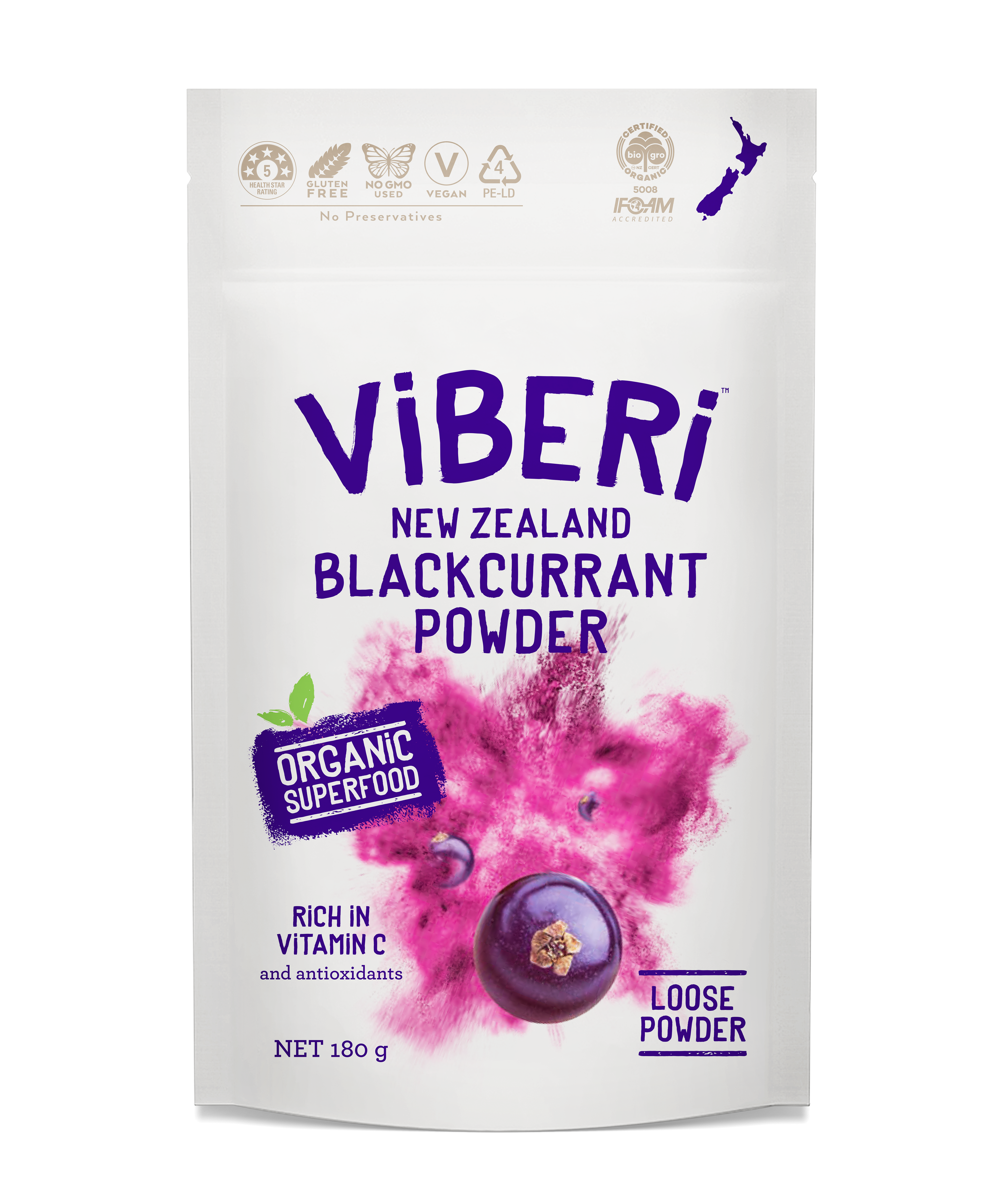 Our ViBERi Blackcurrant Powder is 100% Organic and contains only the pure goodness of New Zealand Blackcurrants.