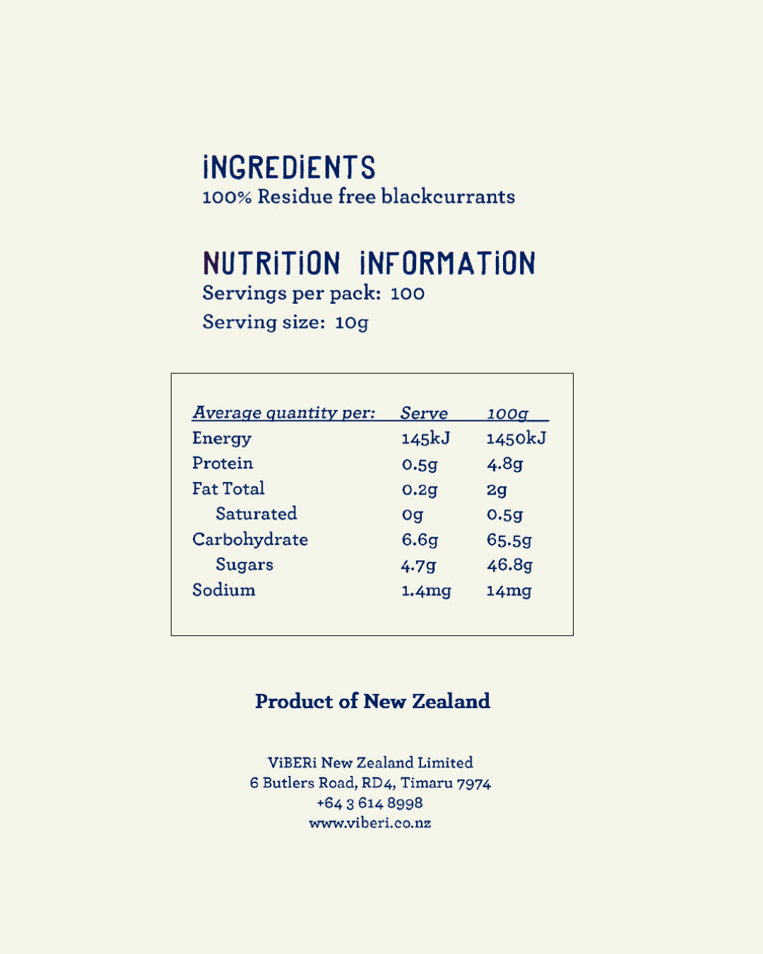 Made from blackcurrants grown during the transition from conventional farming to certified organic status. Freeze dried then made into powder. 100% fruit.