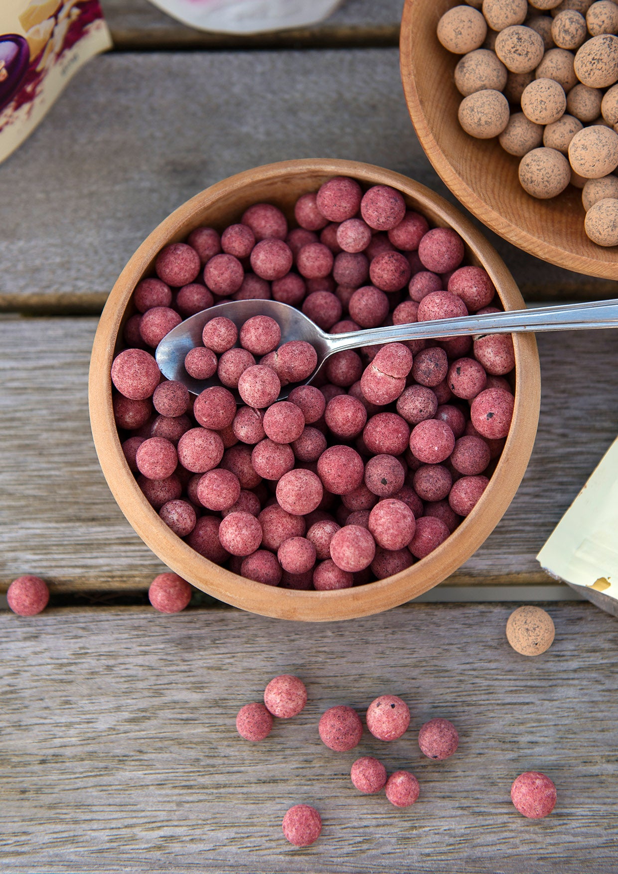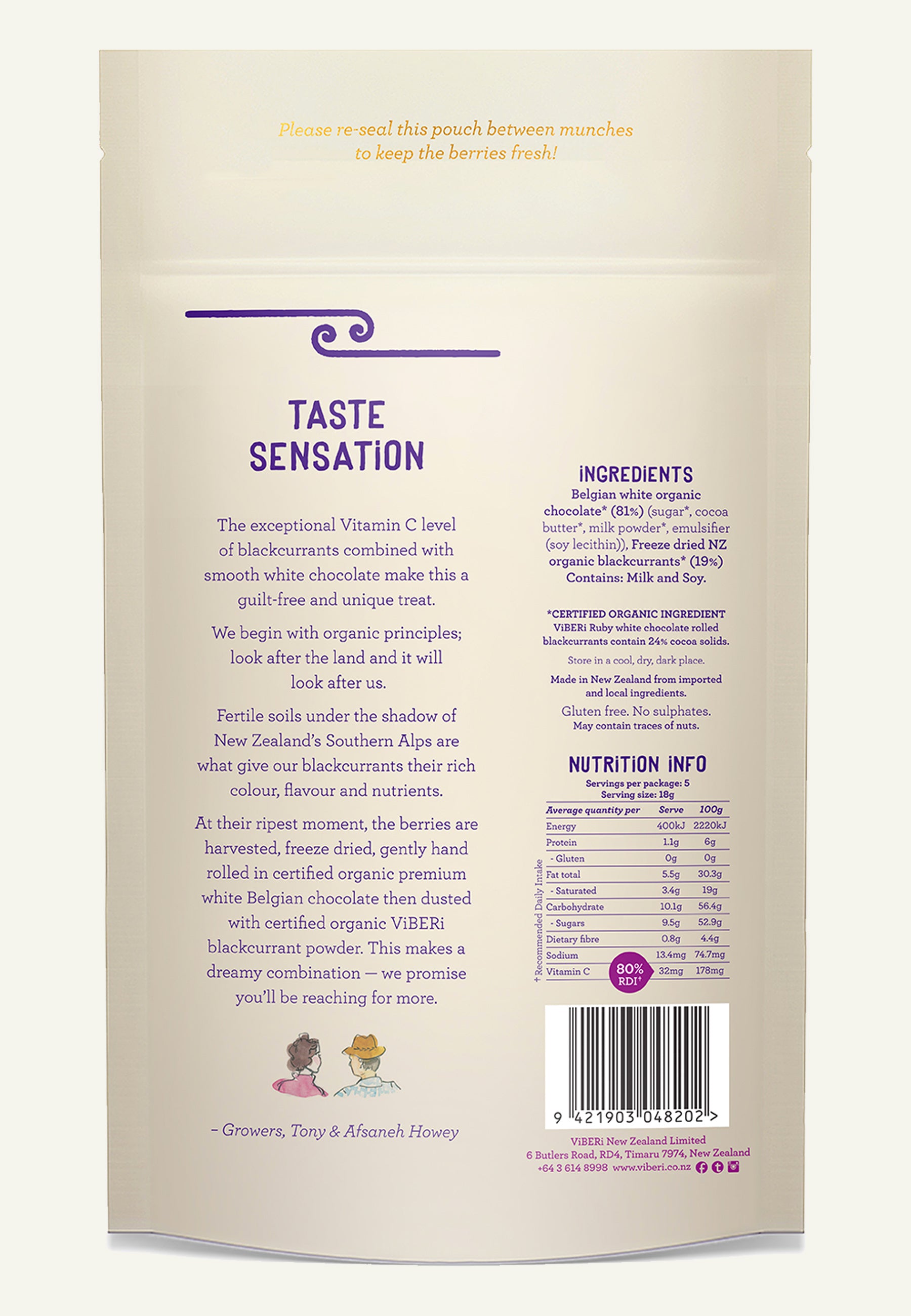 ViBERi organic crispy freeze dried blackcurrants rolled in the highest grade organic Belgian white chocolate and dusted with blackcurrant powder.